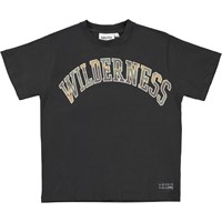 Rodney is a black t-shirt with the text 'Wilderness' on the front. The t-shirt is in a loose, oversized fit.