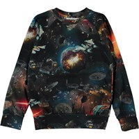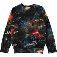 Black and dark blue, long sleeve t-shirt in an all over space print in a retro vibe. In space, with its clear, wild colours, there's fun everywhere you look. We get to follow adventurous spaceships and UFO’s that are looking for excitement in the asteroid belt. This t-shirt is in 100% cotton, has a round neck with a rib edge, long sleeves and a wide rib at the sleeves. It is in a regular fit.