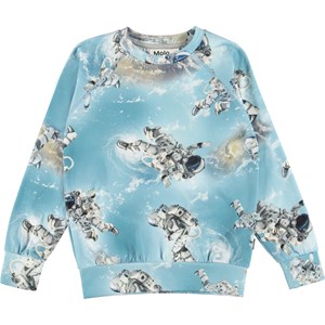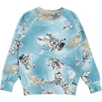 Romeo is a long sleeve light blue top with a print of astronauts flying around in space.