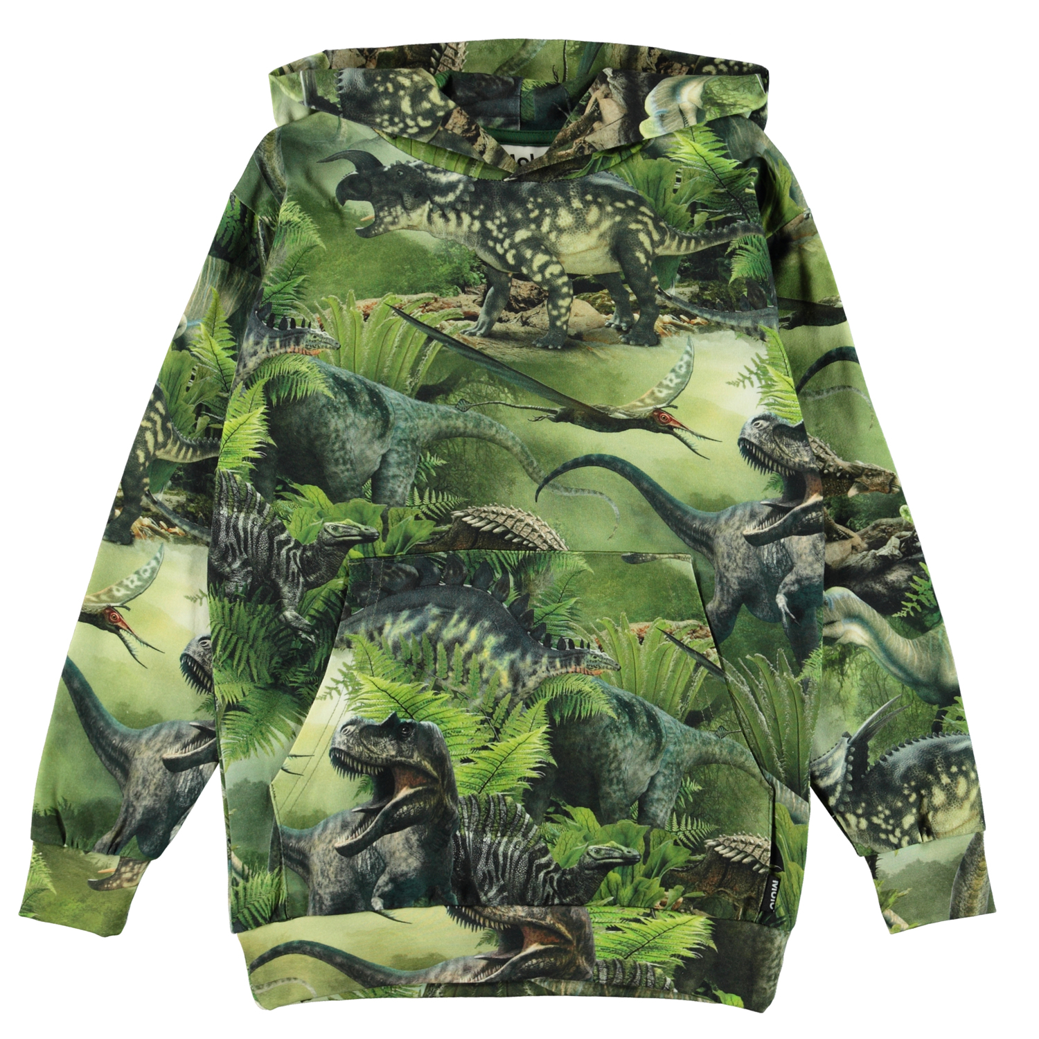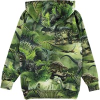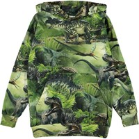 Romo is a green hoodie with a print of dinosaurs. The hoodie has a pouch pocket on the front.