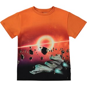 Orange t-shirt with a placement print on the front and back. The print depicts a spaceship and UFO's that are trying to fly around an asteroid belt in space. This t-shirt is constructed in 100% cotton, has short sleeves, a round neck with rib and is in a regular fit.