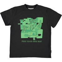 Find your own way' in the neon green print on the front of the Roxo t-shirt. Roxo is a short sleeve black t-shirt.