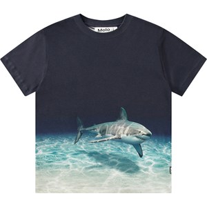 Dark blue T-shirt in organic cotton with short sleeves and ribbed neckline. The T-shirt has a loose fit and a print of a shark in the sea.