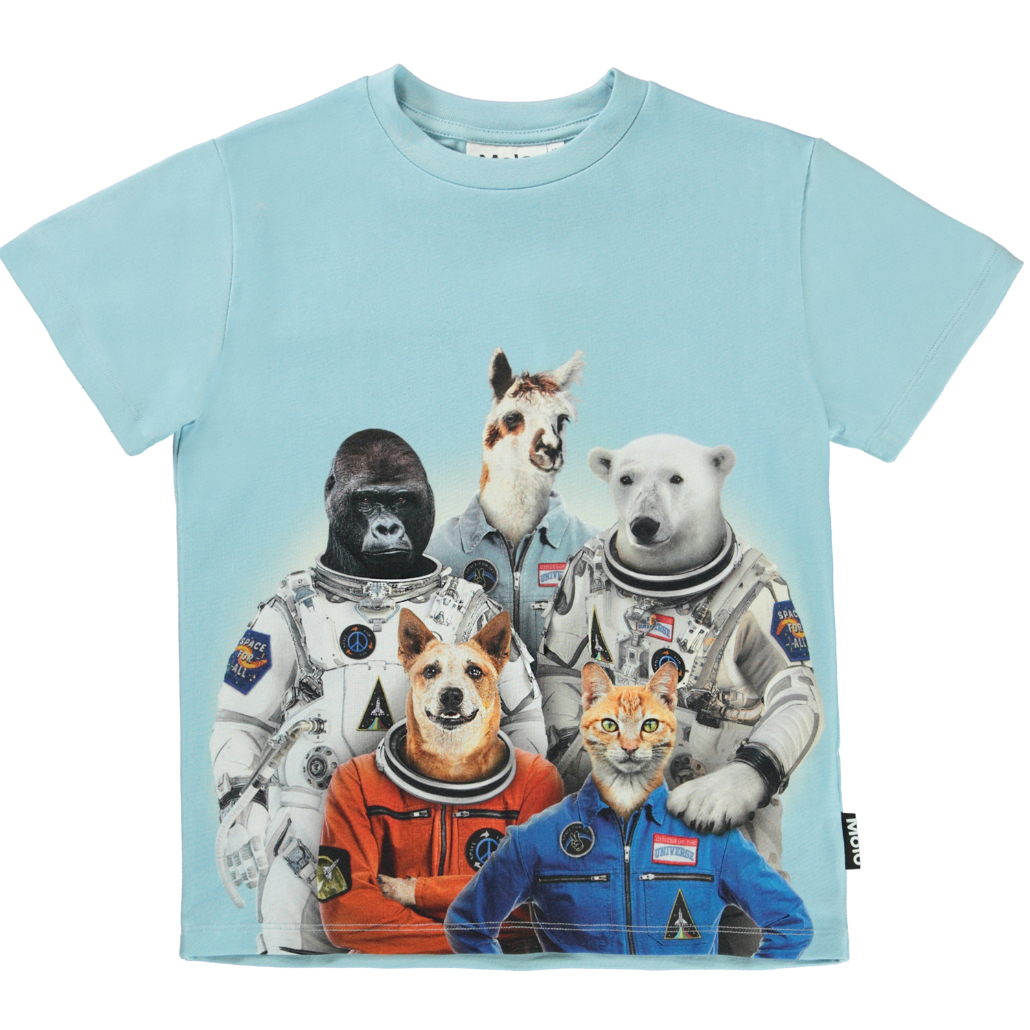 Roxo is a light blue t-shirt with a print on the front of various animals that are ready to travel into space.
