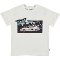 Roxo is a white t-shirt with a print of a fast car, palm trees and the text 'Sunset drive' on the front.