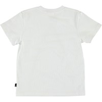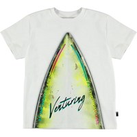 Roxo is a white t-shirt with a print of the tip of a surfboard on the front. Roxo is 100% cotton and has short sleeves.