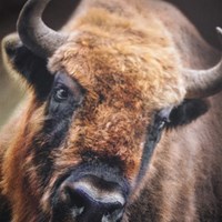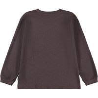 Dark brown, long-sleeved top made of organic cotton with ribbed neckline and sleeves. The long-sleeve top has a loose fit with a front print of a bison.