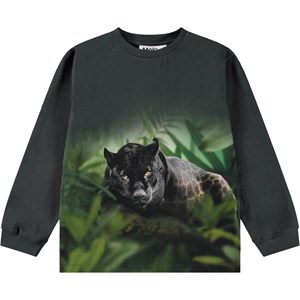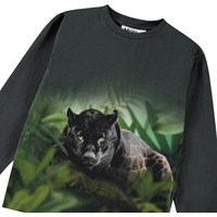 Dark grey long-sleeved top in organic cotton with ribbed trim on the neckline and sleeves. The top features a large front print of a jaguar on the prowl.