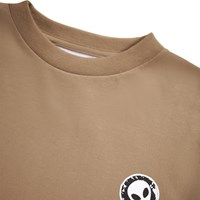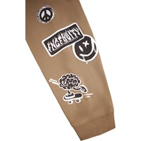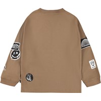 Brown long-sleeved top made of organic cotton with ribbed neckline and sleeves. The long-sleeved top has a loose fit with small black and white prints of stickers with funny and cute statements.