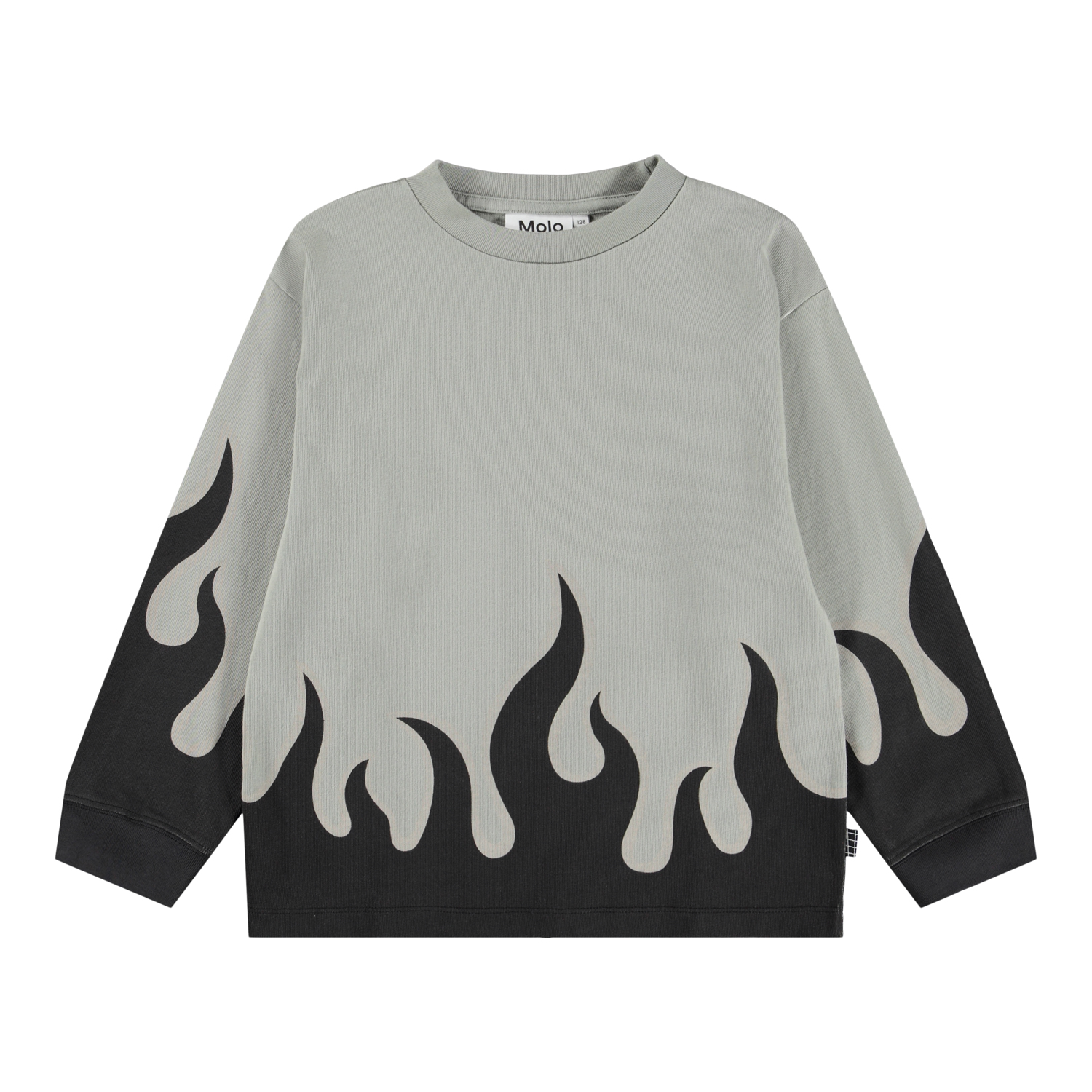 Grey, long-sleeved top made of organic cotton with a ribbed neckline and sleeves. The long-sleeved top has a loose fit with a black flame print at the waist.