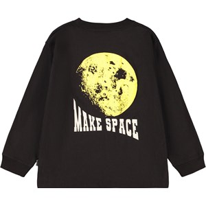 Black long-sleeved top made of organic cotton with a ribbed neckline and sleeves. The long-sleeved top has a loose fit with a large yellow rubber back print of the moon and the text ''Make Space''.