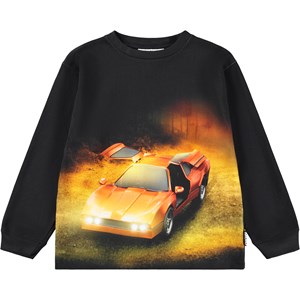 Black, long-sleeved blouse in organic cotton with ribbed neckline and sleeves. The long-sleeved top has a loose fit with a front print of a red sports car in a dark forest.