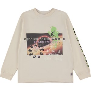 Off-white, long sleeve t-shirt with a placement print on the front and sleeves. The print is a space collage that combines beautiful pictures of planets, texts and aliens, in a cartoon style, that are dancing around and having fun. It begs the eternal question: is anyone out there? This long sleeve t-shirt is in 100% cotton, has a round neck with a rib edge, long sleeves and a rib at the sleeves. It is in a loose fit.