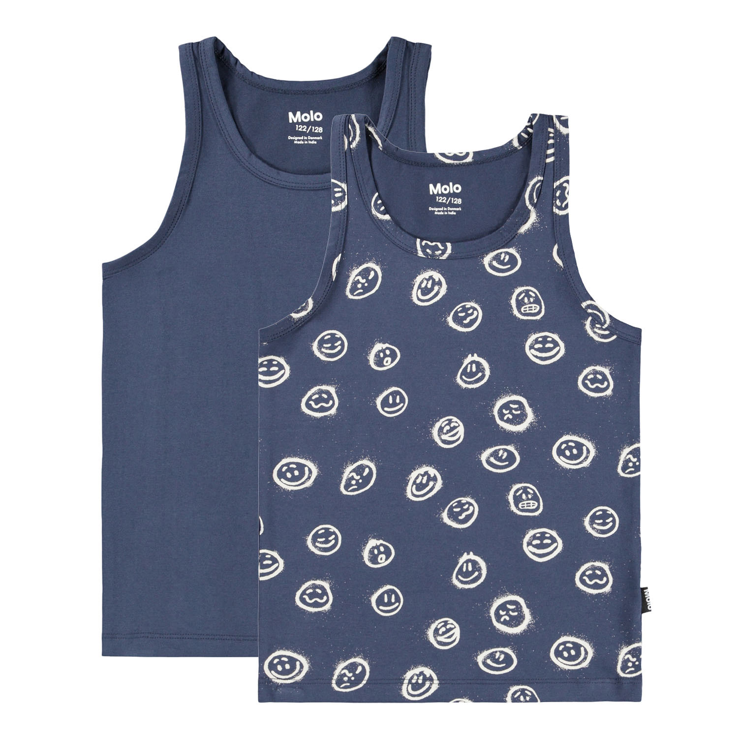 2-pack of tank tops with wide straps and round neck made of soft organic cotton. The pack includes one dark blue and one with a print of smiling faces. Combine it with the matching boxer shorts for a complete set.