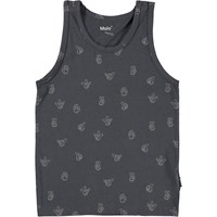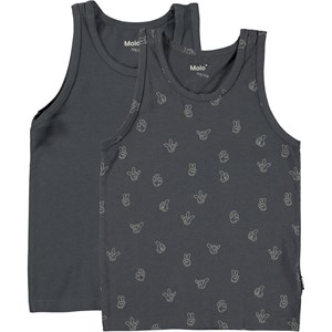 Pack of two cotton vests. They are both grey. One has a print of various small hand signs.