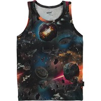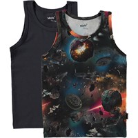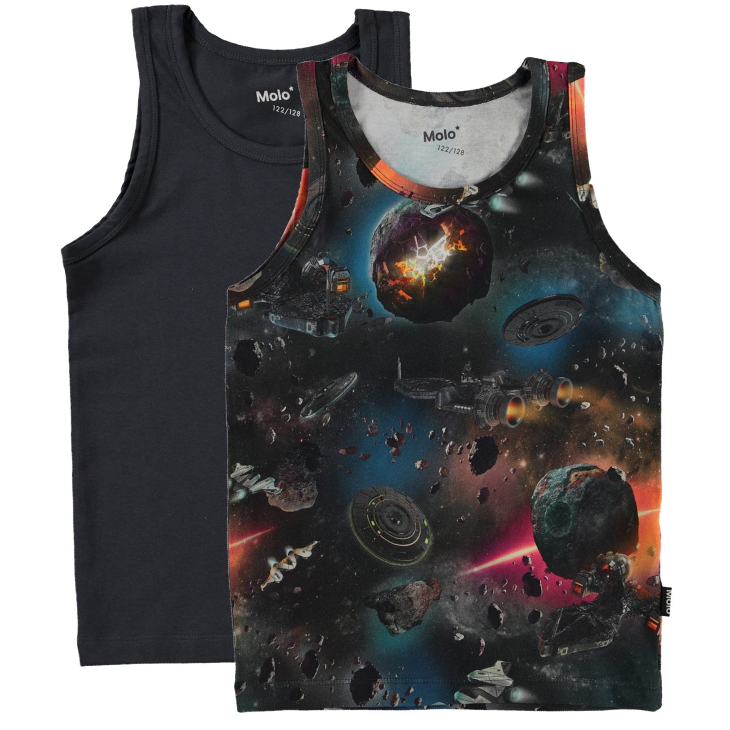 2-pack of our popular Jayden vests. This version has one dark grey vest and one in an all over space print in a retro vibe. Space is fun and full of clear, wild colours. We follow daring spaceships and UFO’s that are looking for new adventures in the asteroid belt. The vests are constructed in 100% soft cotton jersey. You can use this 2-pack of vests with our Justin 2-pack, which are matching boxer shorts