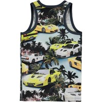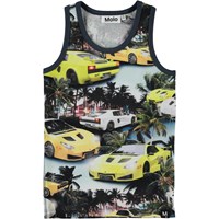 Jim is a vest with a print of fast cars and palm trees on a light blue background.