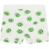 2-pack of organic boxershorts. One pair is in green and the other is in white with green smiling faces