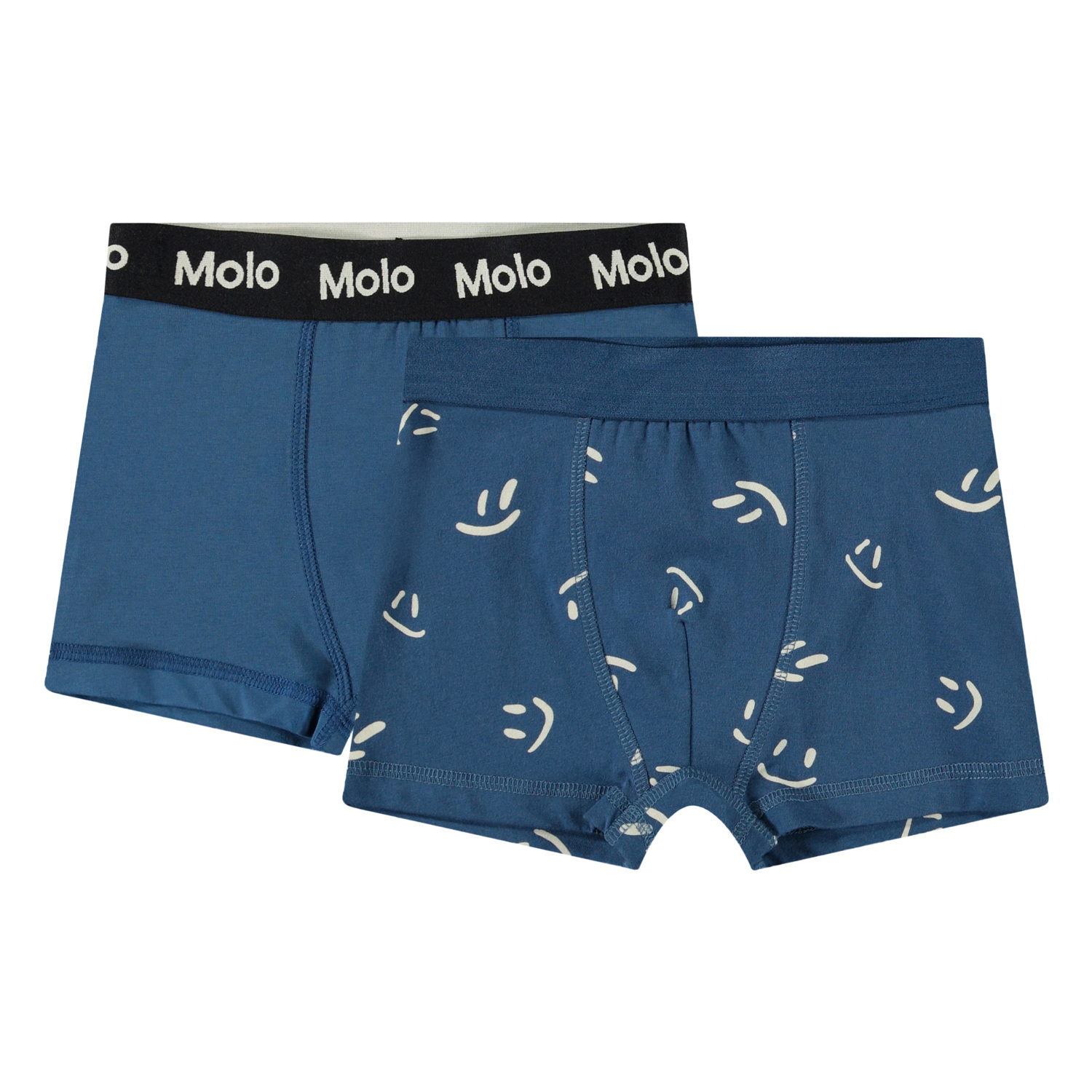 2-pack of boxer shorts in soft organic cotton. The pack includes a pair of dark blue boxer shorts and a pair with a print of smiling faces.
