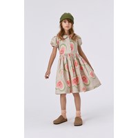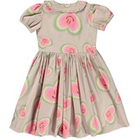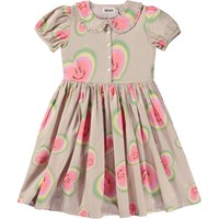 Beige knee length dress with the all over aura heart print. Imagine that everything has an aura- people, plants and animals. The print is of aura hearts that are glowing with colours, smiles and love. Aura colours are like the colours of the rainbow and reflect the feelings of our inner spirit. We are willing to open our hearts to all the things we cannot see and believe that there is more to life than what our eyes can see. This dress is in 100% cotton jersey and has a round neck with a Peter Pan collar. It has small puff sleeves, a placket and button closure on the front, a full skirt and is in a regular fit.
