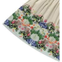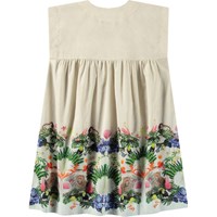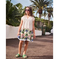 Beige loose dress in organic cotton. The dress is knee-length, with wide straps, a v-neck, and ruching in the skirt. The material of the dress is light and airy, making it ideal for the pool or beach. The dress has a colourful jungle print at the bottom of the skirt.