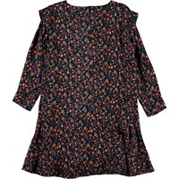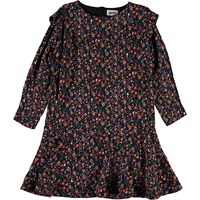 Calissa is a dress with a small floral print and long sleeves. The dress has a small ruffle on the shoulders and flares slightly at the bottom. The dress has a zip closure at the neck.
