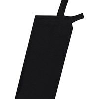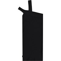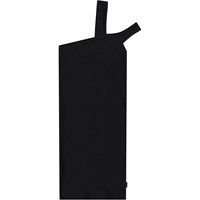 Knee-length black strappy dress in stretchy soft viscose rib. The dress has a close-fitting shape with two straps on the left shoulder, one going up over the shoulder, while the other sits down over the shoulder.