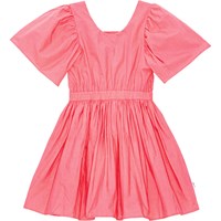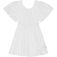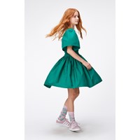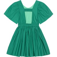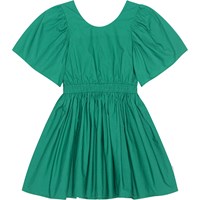 Green, knee length dress in organic cotton. The dress has a round neck and full, gathered sleeves. It has an open back with an elastic strap. The elastic waist makes the dress comfortable and easy to wear, and it also creates a lot of fullness in the skirt.