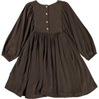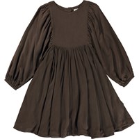 Caly is a dark brown dress with full sleeves and a zip closure at the neck.