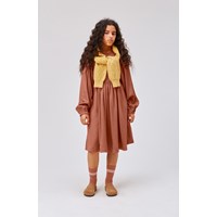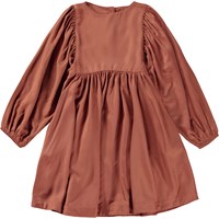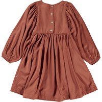 Caly is a knee length, red-brown dress in 100% viscose. The dress has long, full sleeves with elastic at the wrists. The dress is in a loose fit with pockets and a button closure on the back.