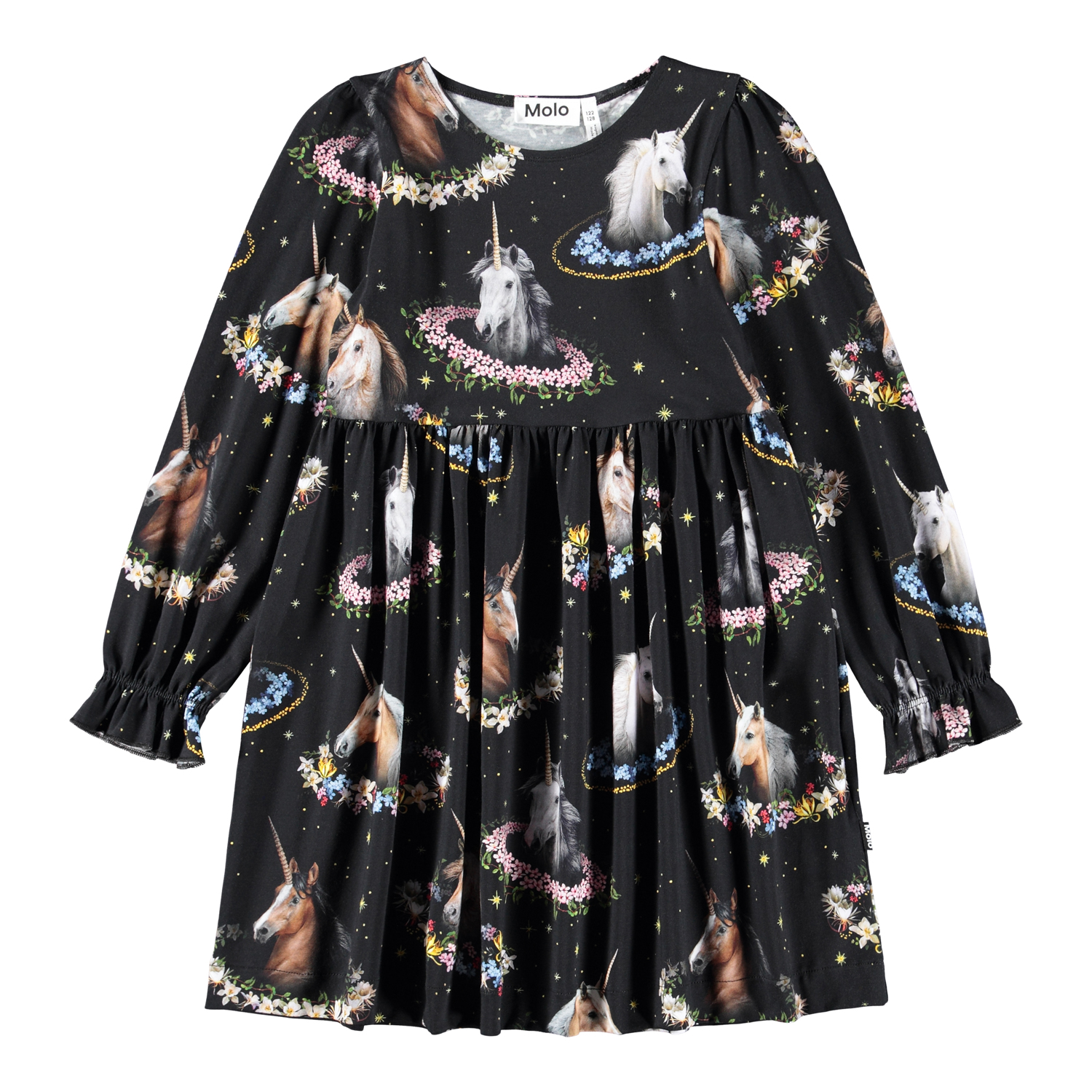 Black jersey dress made of organic cotton with a loose fit, a round neckline and long sleeves with a small ruffle edge. The skirt has a lot of gathers and a print of unicorns and flowers.