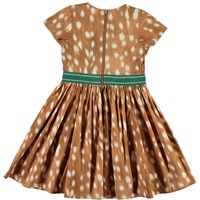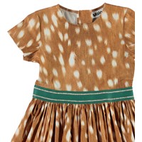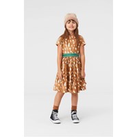 Candy is a brown dress with white spots that look like the buckskin of a deer. It is constructed in a stretch poplin, which makes it extra comfortable. Candy has a zip closure at the neck and a striped elastic waist.