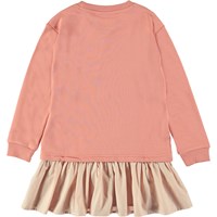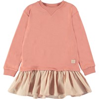 Caprice is a rose coloured dress with sporty and feminine details. The top of the dress is sweatshirt-inspired, while the bottom is an airy, powder-coloured skirt.