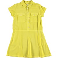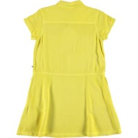 Caris is a yellow dress with short sleeves, a collar and a button closure as well as front pockets.
