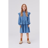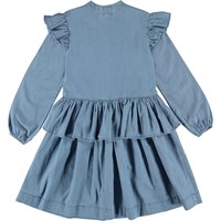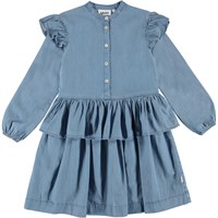 Carisma is a blue denim dress with ruffle edges on the shoulders and a peplum. The dress has buttons on the front.