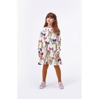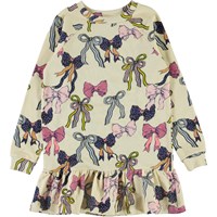 Carlotta is a soft, sweatshirt dress in cotton with long sleeves. It is cream coloured and has a print of beautiful bows in different colours.