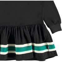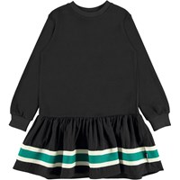 Carmen is a black dress that has a little skirt with green and white stripes at the bottom. It has long sleeves and is incredibly soft.