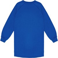 Blue jersey dress in soft organic cotton with a loose fit, ribbed edges at the neckline and sleeves, and a brushed inner face that makes it extra soft and warm to wear. The dress features a black embroidered smiling face on the front.