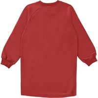 Carola is a red sweatshirt dress with longs sleeves. The dress has a print of a pink smiley face on the front.