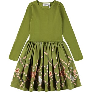 Long-sleeved green dress made of organic cotton with a fitted ribbed top, a round neckline and a voluminous circular-cut skirt made of cotton flannel. The skirt has a print of forest animals and a pattern of flowers.