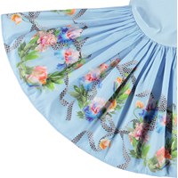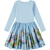 Long-sleeved light blue dress in organic cotton with a fitted ribbed jersey top and poplin skirt. The dress has a regular fit with a print on the skirt of bows tied with a checkered ribbon and artistic tulips.