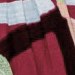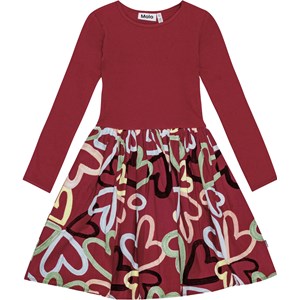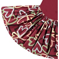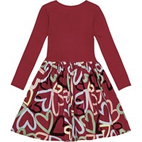 Long-sleeved bordeaux dress in organic cotton with a snug ribbed jersey top, round neck, and a voluminous circle skirt in cotton poplin. The skirt is adorned with a print of hand-painted hearts in various colours, forming a multitude of four-leaf clovers.