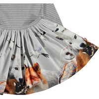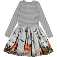 Casie is a long sleeve dress in two parts. The top is in grey striped rib, while the skirt is in a print of various animals of the forest.