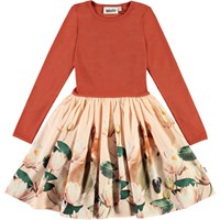 Casie is a long sleeve dress in two parts. The top is in a red rib, while the skirt is in a foal print with pink water lilies.