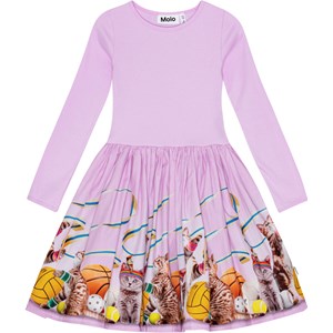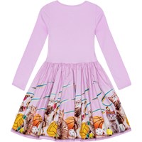 Long-sleeved pink dress in organic cotton with a snug ribbed jersey top, round neckline, and a voluminous circle skirt in cotton poplin featuring a charming print of kittens in sportswear.