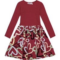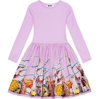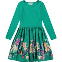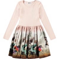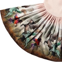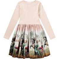 Long-sleeved powder-coloured dress in organic cotton with a snug ribbed jersey top, round neckline, and a voluminous circle skirt in cotton poplin featuring a colourful print of imaginative animals such as leopard horses, green zebras, and winged horses.