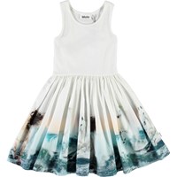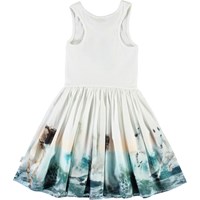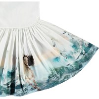 Cassandra is a sleeveless dress with a white rib top and a feminine poplin skirt in light blue and white, with a print of horses playing in the water.
