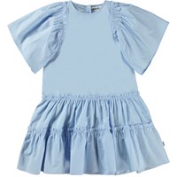 Cat is a pink dress in a loose fit. The dress is in organic cotton and has raised shoulder seams with short sleeves and a back zip closure. The full skirt begins at the hips and consists of large, sewn on ruffles that stop at the knees.