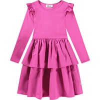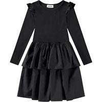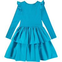 Long-sleeved Turquoise dress in organic cotton with a snug ribbed jersey top, round neckline, a small ruffle at the shoulders, and a double-layered cotton poplin skirt that adds plenty of gathering and volume.