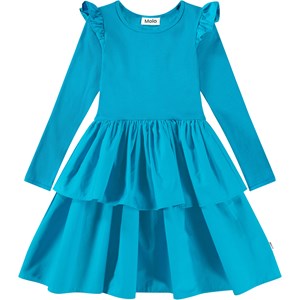 Long-sleeved Turquoise dress in organic cotton with a snug ribbed jersey top, round neckline, a small ruffle at the shoulders, and a double-layered cotton poplin skirt that adds plenty of gathering and volume.